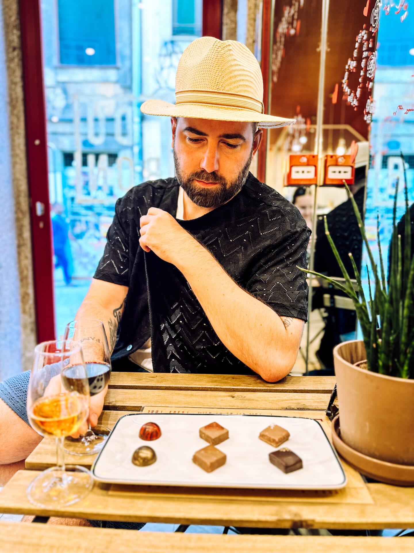 Absoluter Sweet Spot und Must Visit in Porto: Die Du Bon Chocolate Bar lag direkt eine Haustür weiter von unserem Airbnb und es war klar: Beim Comeback musste ein neuer Besuch her. In der kleinen charming Manufaktur würde Schokoladenfabrik-Charlie Urlaub machen und sein goldenes Ticket da lassen. In der Auslage flirtet eine Pralinen-Party um die Wette – gefüllt mit Nüssen, Chilli, Cognac, Kokos und geremixt aus allem, was der Schoko-DJ hergibt. Die Pralinen-DJanes erklären genau, was wie wo drin ist, und dazu gibt’s als Pairing eine Auswahl an Portwein – mir hat am besten die länger gereifte Variante von Rot und Weiß gefallen. Eine Bar, an der man seine süße Seite ausleben kann! Oder einfach mit einem Weißwein oder Drink an dem einen kleinen Tisch draußen bisschen Daydrinking zelebriert.